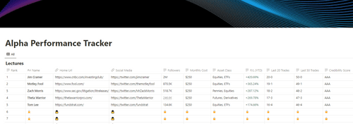 The ranking system is a dynamic ranking for all entities, social media accounts, organizations, and influential figures that broadcast and supply Subscription Financial Education and Research. The metrics used for evaluating said entities are based on performance of the research and tips and involves a multifaceted approach designed to ensure accuracy and transparency. An entities' ranking is found using our intelligent algorithm to score and rank entities so you can quickly see what matters most in real-time. In other words, it supplies a clear picture of the historical performance of research for each subscription service.